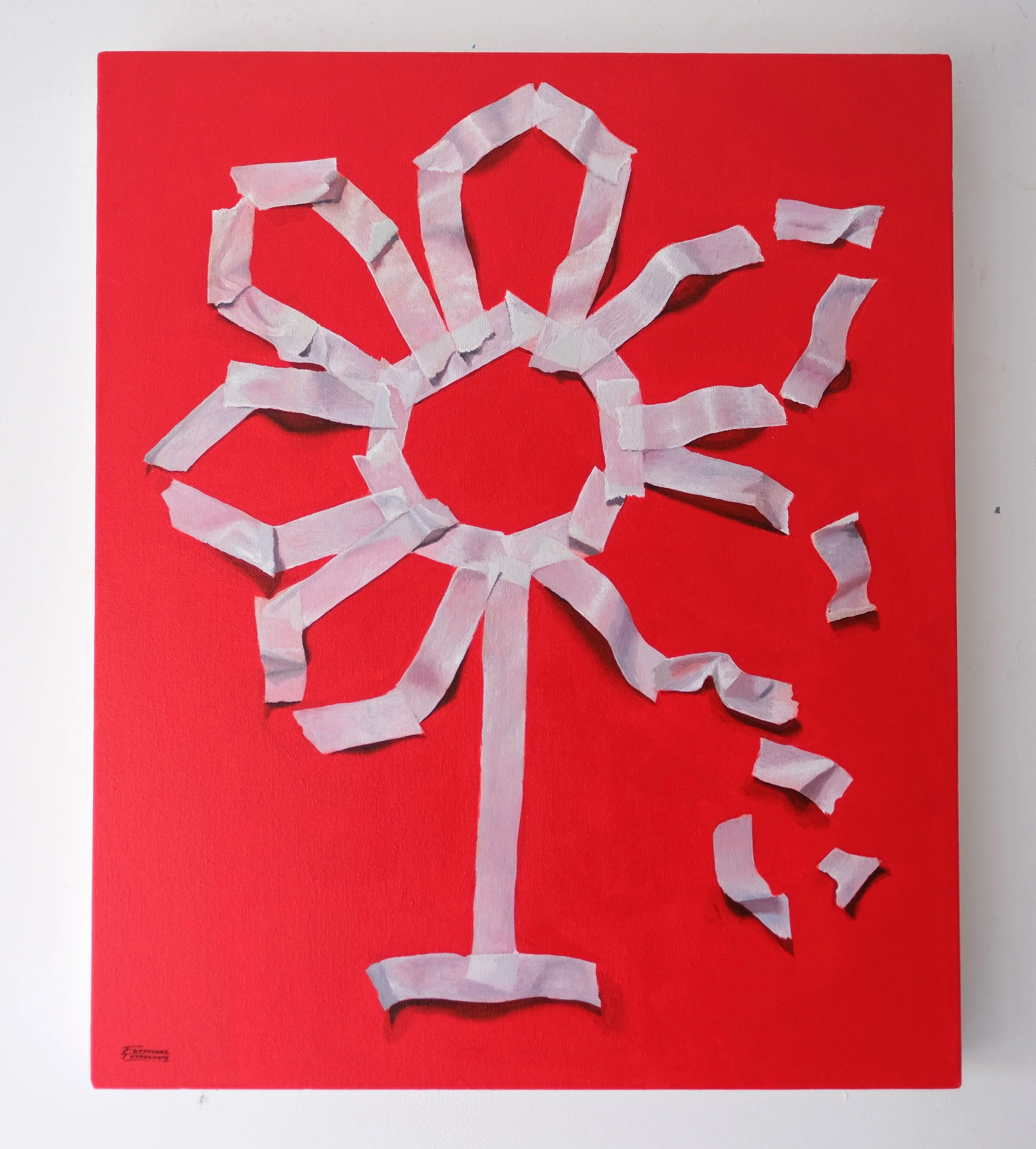 A red canvas with white duct tape arranged in a snowflake shape on a white wall.