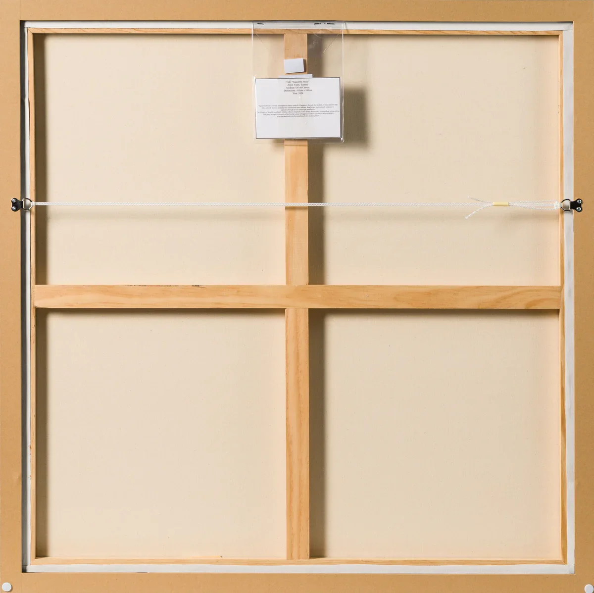 The back of a framed canvas painting with a wooden frame, a label attached at the top center, and a wire stretched across the back for hanging.